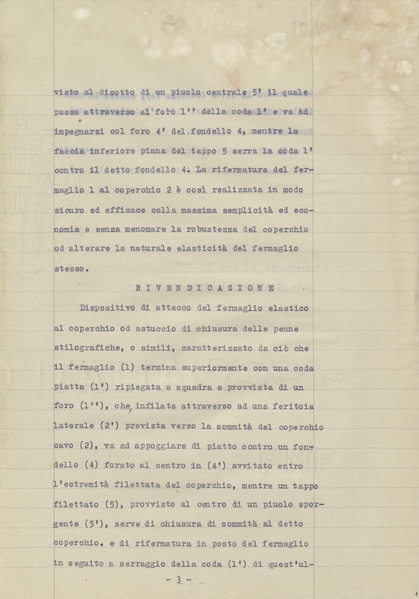 Privativa industriale per un modello di utilità della Giacomazzi. Testo descrittivo della registrazione: "Dispositivo di attacco del fermaglio elastico al coperchio di chiusura delle penne stilografiche, e simili.".