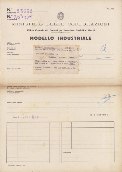 Privativa industriale per un modello di utilità. Testo descrittivo della registrazione: "Dispositivo di riempimento a stantuffo per penne stilografiche a serbatoio".