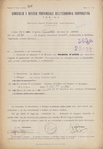 Privativa industriale per un modello di utilità. Testo descrittivo della registrazione: "Dispositivo di riempimento a stantuffo per penne stilografiche a serbatoio".