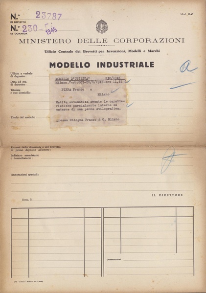 Privativa industriale per un modello di utilità. Testo descrittivo della registrazione: "Matita automatica avente le caratteristiche parzialmente interne ed esterne di una penna stilografica".