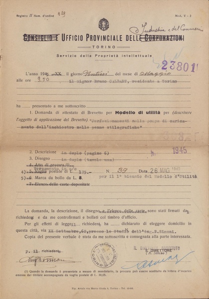 Privativa industriale per un modello di utilità. Testo descrittivo della registrazione: "Perfezionamenti nella pompa di caricamento dell'inchiostro nelle penne stilografiche".
