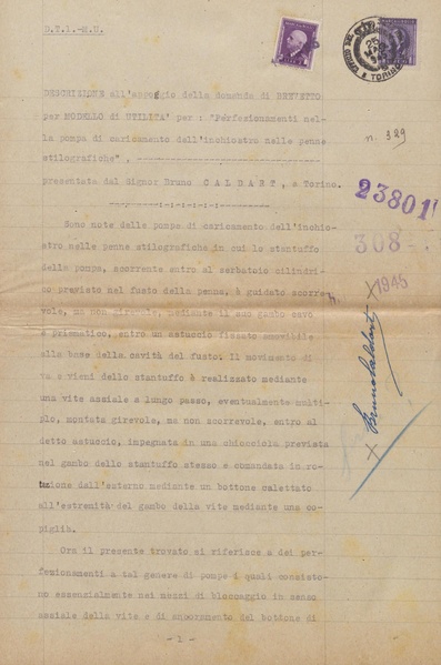 Privativa industriale per un modello di utilità. Testo descrittivo della registrazione: "Perfezionamenti nella pompa di caricamento dell'inchiostro nelle penne stilografiche".