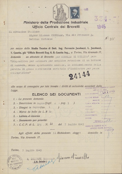 Privativa industriale per un modello di utilità. Testo descrittivo della registrazione: "Dispositivo per azionare per semplice rotazione di un bottone di manovra, senza spostamento assiale, lo schiacciamento della peretta di gomma costituente serbatoio d'inchiostro per penne stilografiche".