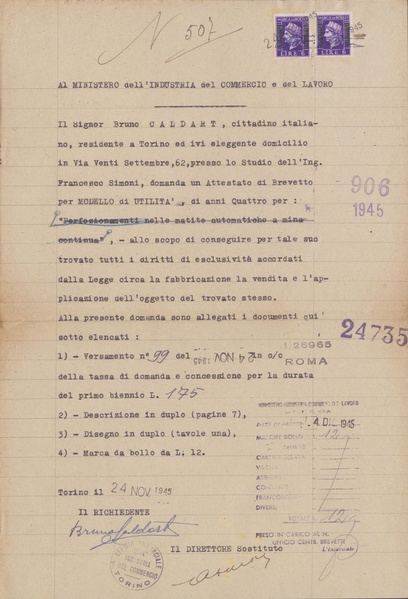 Privativa industriale per un modello di utilità. Testo descrittivo della registrazione: "Matita automatica a mina continua con mezzi di collegamento e ritenute facilmente amovibili".
