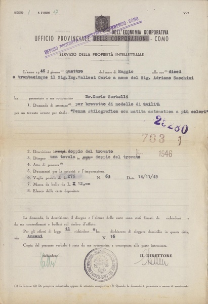 Privativa industriale per un modello di utilità. Testo descrittivo della registrazione: "Penna stilografica con matita automatica a più colori".