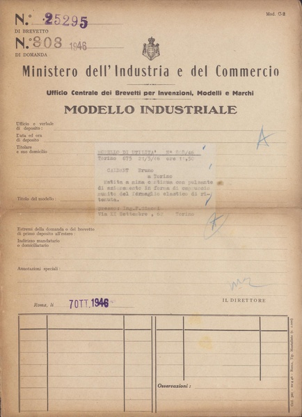 Privativa industriale per un modello di utilità. Testo descrittivo della registrazione: "Matita a mina continua con pulsante di azionamento in forma da cappuccio munito del fermaglio elastico di ritenuta stilografiche".