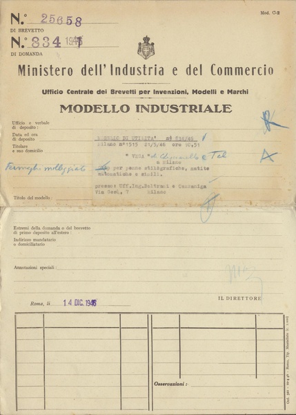 Privativa industriale per un modello di utilità della VEGA. Testo descrittivo della registrazione: "Fermaglio molleggiato per penne stilografiche, matite automatiche e simili".