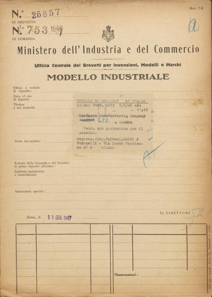 Privativa industriale per un modello di utilità della Mentmore. Testo descrittivo della registrazione: "Penna con protezione per il pennino".