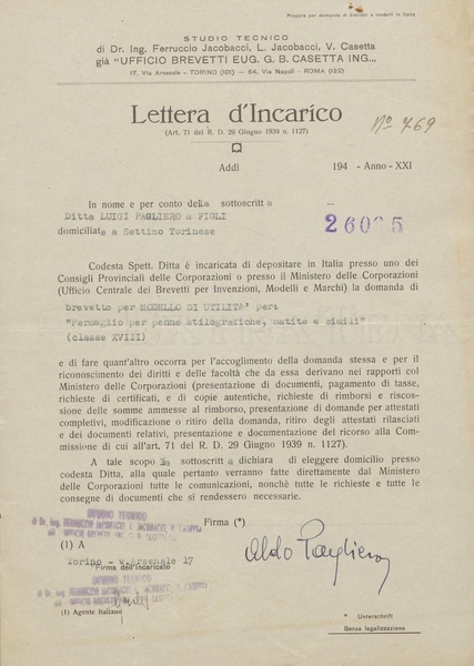 Privativa industriale per un modello di utilità della Pagliero. Testo descrittivo della registrazione: "Fermaglio per penne stilografiche, matite e simili".