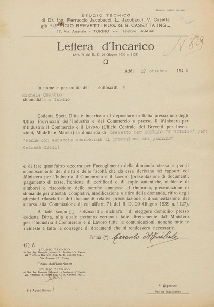 Privativa industriale per un modello di fabbrica. Testo descrittivo della registrazione: "Penna con astuccio scorrevole di protezione del pennino".