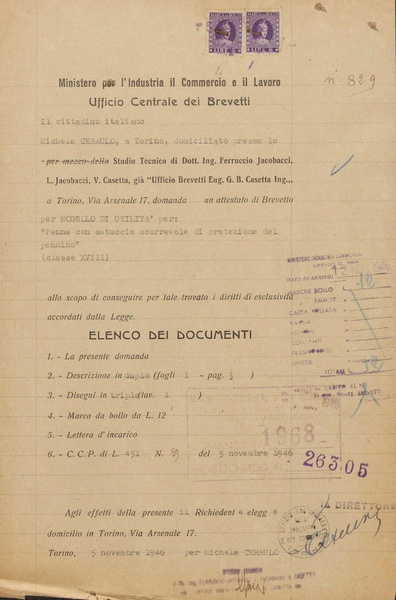 Privativa industriale per un modello di fabbrica. Testo descrittivo della registrazione: "Penna con astuccio scorrevole di protezione del pennino".