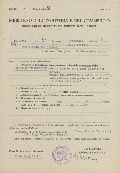Privativa industriale per un modello ornamentale della Parker. Testo descrittivo della registrazione: "Penna stilografica a forma di sigaro, con pennino sporgente ad un estremo a guisa di unghia".