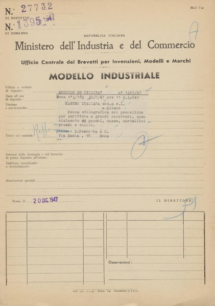 Privativa industriale per un modello di utilità. Testo descrittivo della registrazione: "Penna stilografica con pennellino per scrittura a grandi caratteri, specialmente su pacchi, casse, cartellini, prezzi e simili".