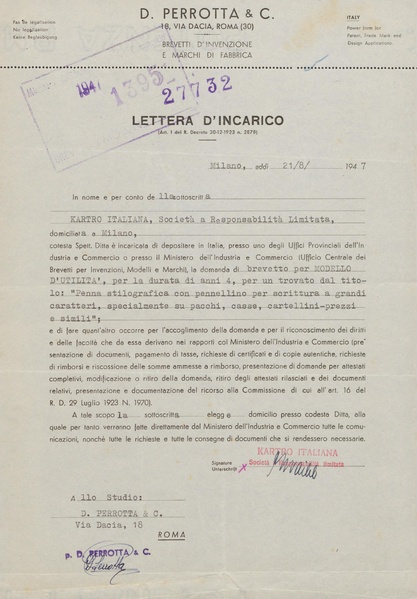 Privativa industriale per un modello di utilità. Testo descrittivo della registrazione: "Penna stilografica con pennellino per scrittura a grandi caratteri, specialmente su pacchi, casse, cartellini, prezzi e simili".