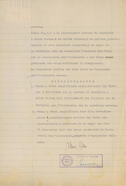 Privativa industriale per un modello di utilità della Corona di Mario Diaz. Testo descrittivo della registrazione: "Penna a sfera semplificata".