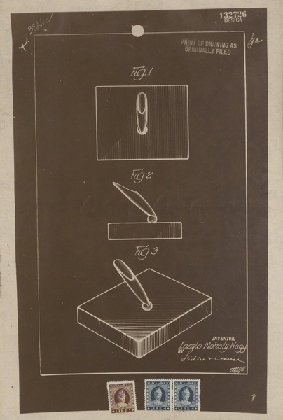 Fa riferimento ad un brevetto di design americano di Laszlo Moholy-Nagy, D132726 del 22 agosto 1946, inesistente. Interessanti i documenti per la registrazione a titolo della moglie.