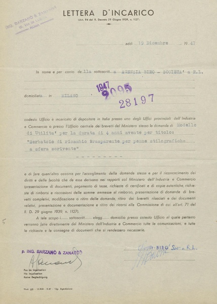 Privativa industriale per un modello di utilità. Testo descrittivo della registrazione: "Serbatoio di ricambio trasparente per penne stilografiche a sfera scrivente".