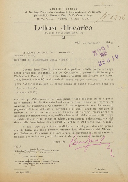 Privativa industriale per un modello di utilità. Testo descrittivo della registrazione: "Dispositivo per il riempimento di penne stilografiche del tipo a sfera".