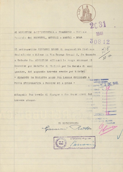 Privativa industriale per un modello di utilità. Testo descrittivo della registrazione: "Penna stilografica a sfera provvista di due organi di scrittura spostabili contemporaneamente in senso assiale nell'interno della penna stessa".