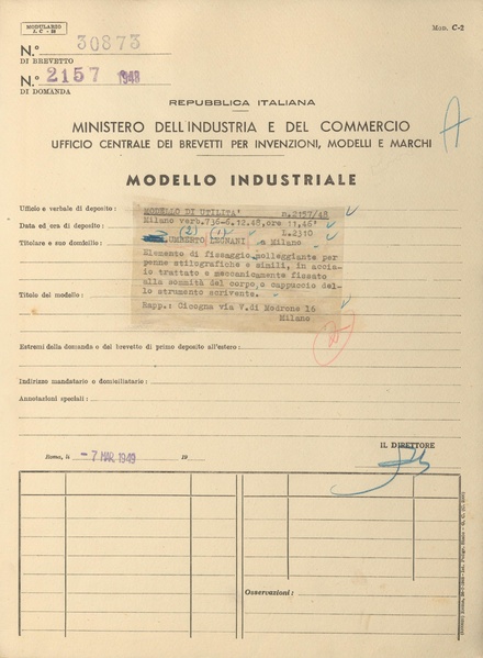 Privativa industriale per un modello di utilità della LUS. Testo descrittivo della registrazione: "Elemento di fissaggio molleggiante per penne stilografiche e simili, in acciaio trattato e meccanicamente fissato alla sommità del corpo, o cappuccio dello strumento scrivente".
