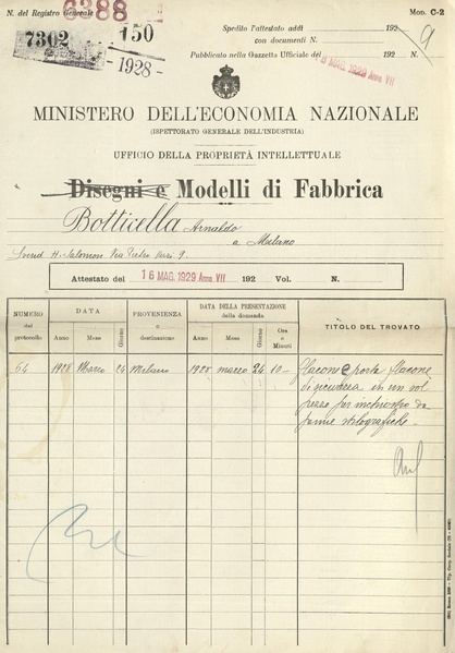 Privativa industriale per un modello di fabbrica. Testo descrittivo della registrazione: "Flacone e porta flacone di sicurezza in un sol pezzo per inchiostro da penne stilografiche".