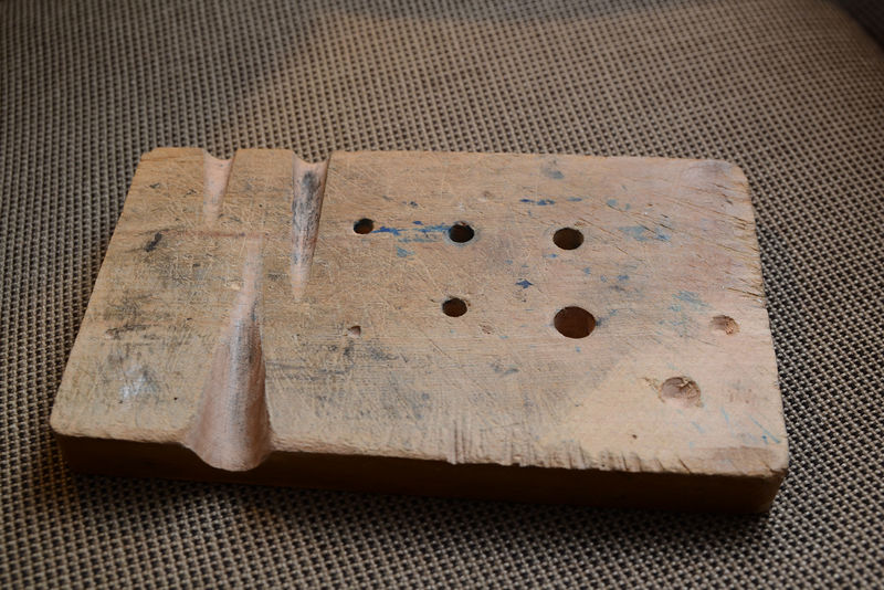 Una tavola di legno con opportune incisione usata per il ripristino delle ammaccature, in particolare per le punte dei cappucci si usino le avvallature create con una punta di trapano nella parte in basso a destra. Contributo di Massimo (utente forum maxpop55).