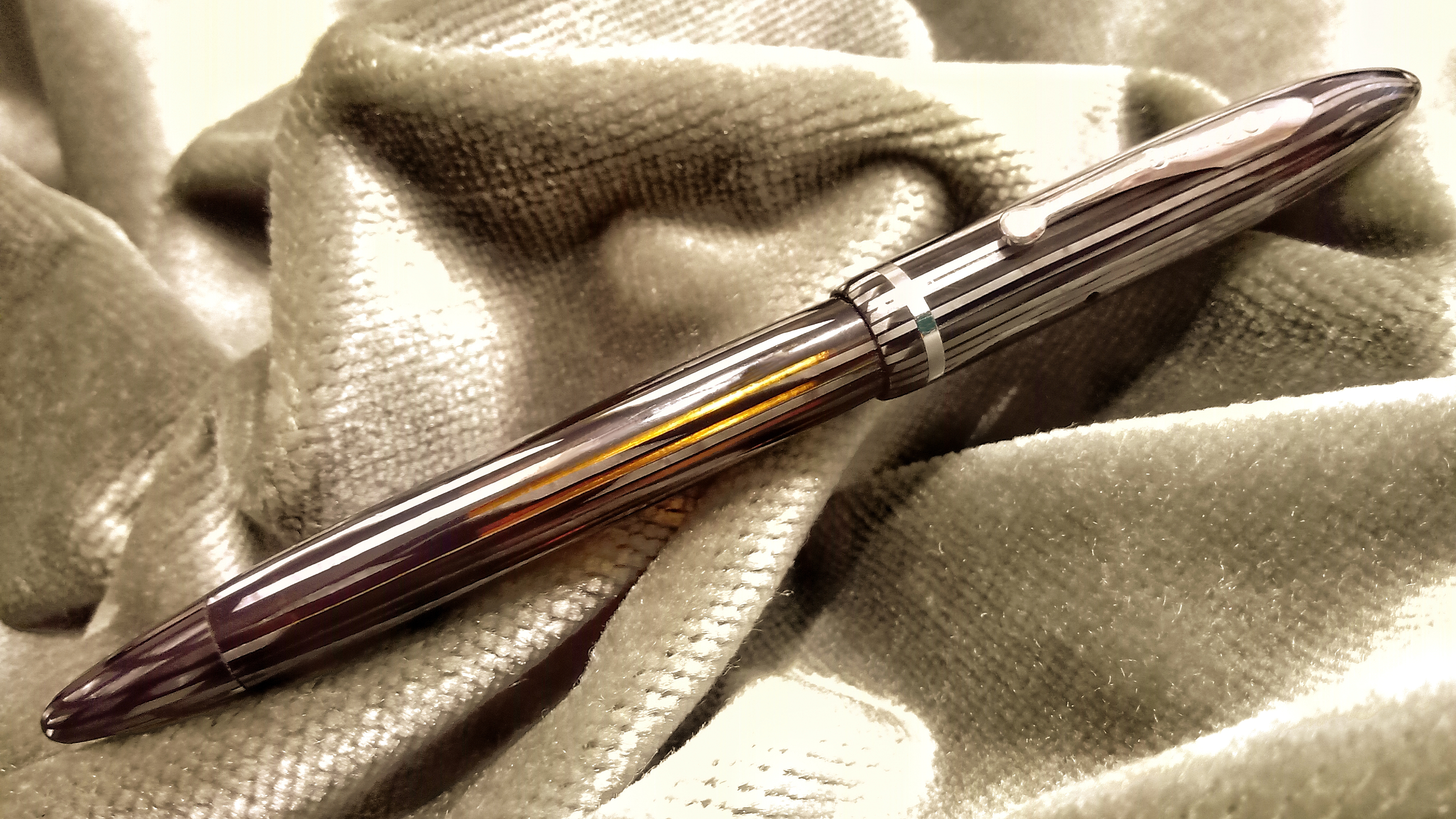 Foto di una penna Sheaffer. Modello: Balance. Caricamento a siringa rovesciata. Realizzazione in celluloide rigata grigia. Versione "Junior", codice P2W (P=Gray, 3=Junior, W=One-stroke). Contributo di Gustavo, (utente forum gfrico2000).