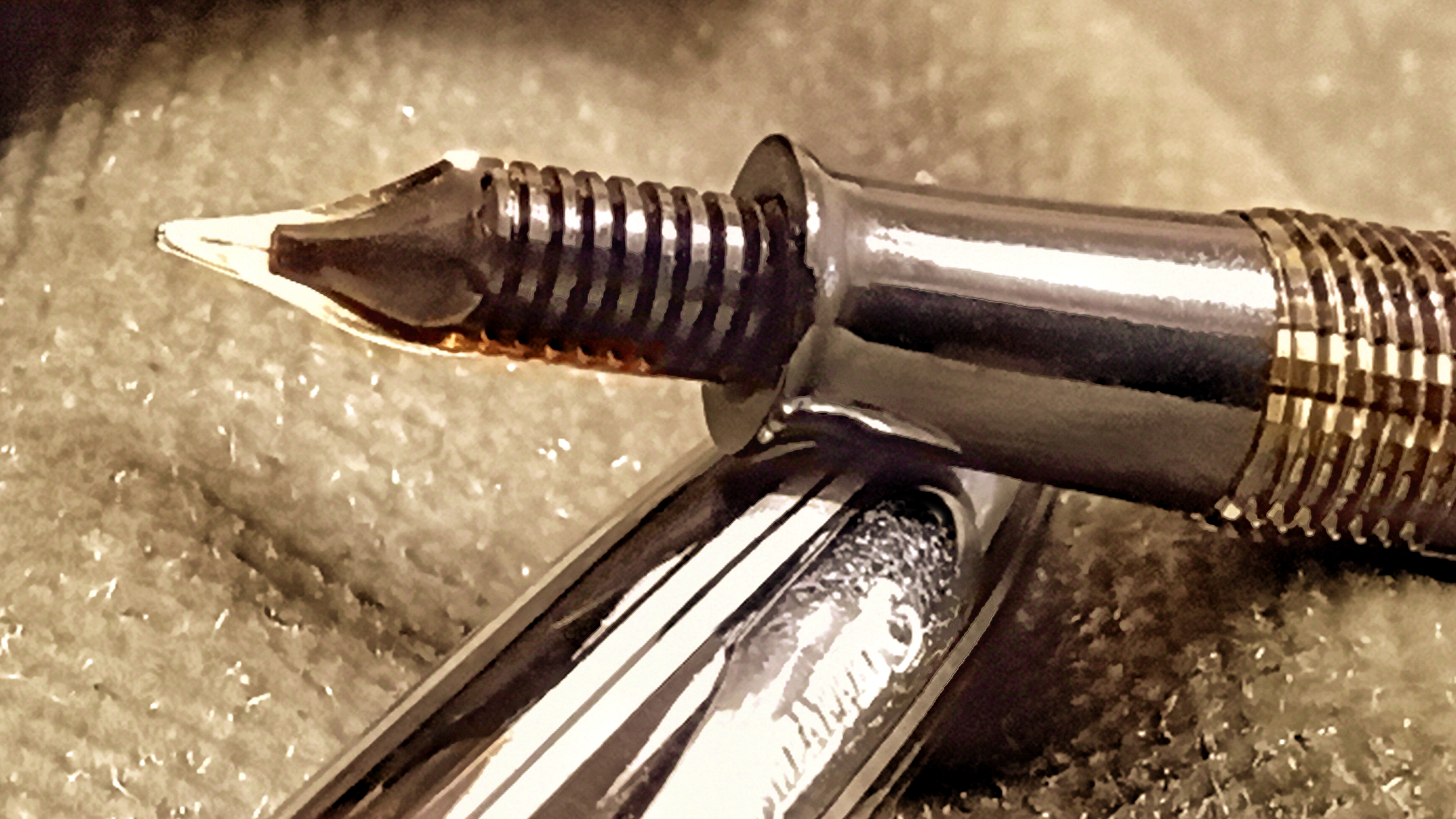 Foto di una penna Sheaffer. Modello: Balance. Caricamento a siringa rovesciata. Realizzazione in celluloide rigata grigia. Versione "Junior", codice P2W (P=Gray, 3=Junior, W=One-stroke). Contributo di Gustavo, (utente forum gfrico2000).