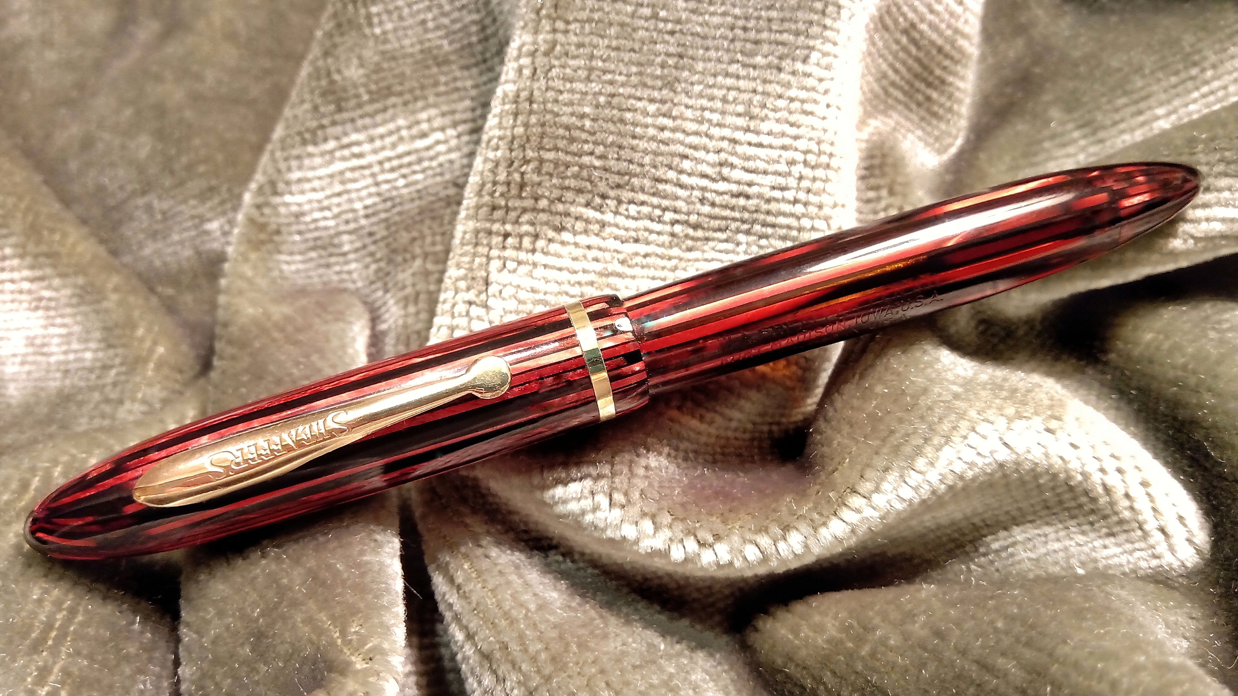 Photo of a pen produced by Sheaffer. Model: Balance. Filling system: plunger filler. In red lined celluloid. "Miss Universe" version, code S3WS (S=Red, 3=Miss Universe, W=One-stroke, S=short).