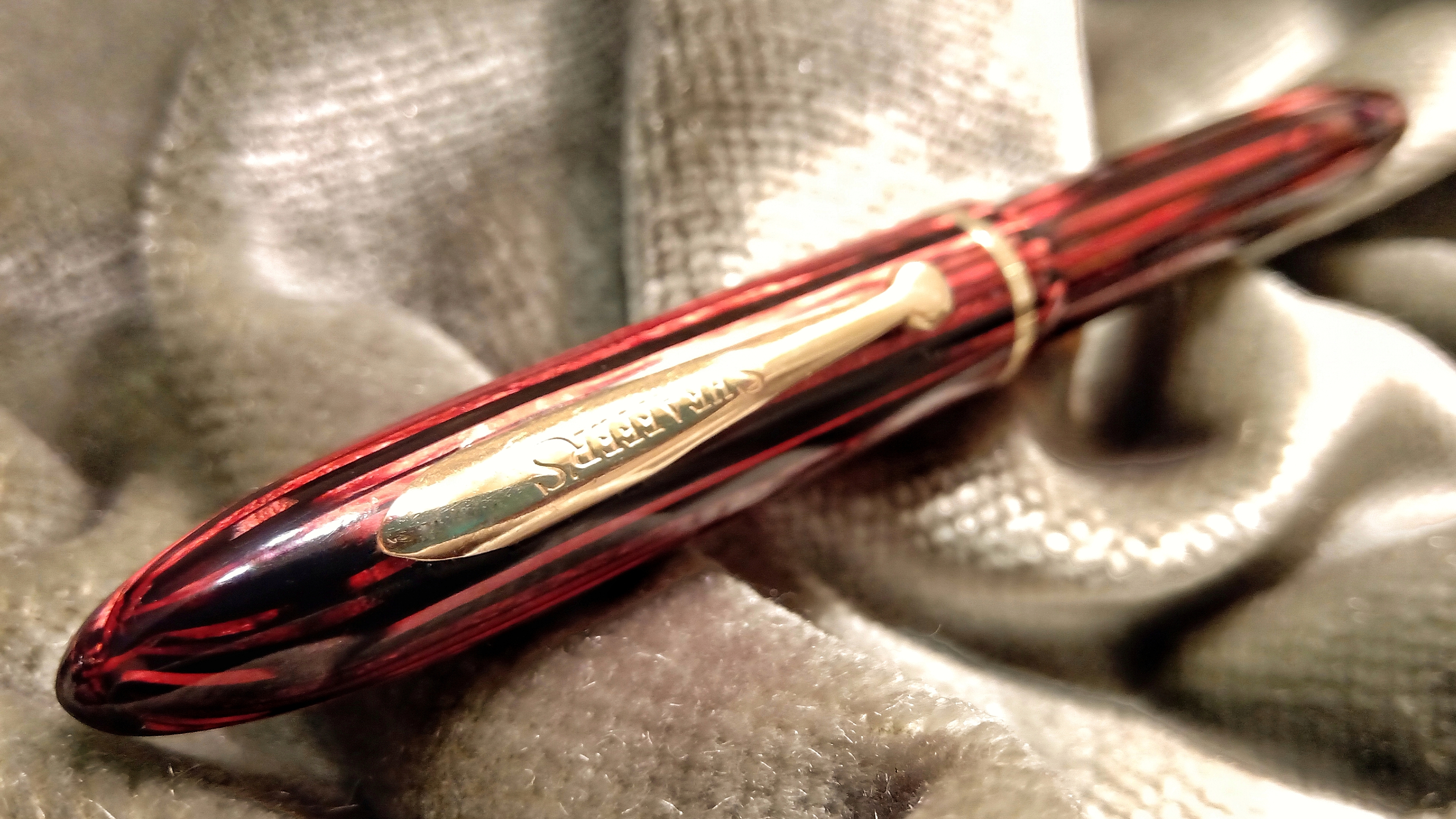 Photo of a pen produced by Sheaffer. Model: Balance. Filling system: plunger filler. In red lined celluloid. "Miss Universe" version, code S3WS (S=Red, 3=Miss Universe, W=One-stroke, S=short).