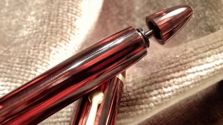 Photo of a pen produced by Sheaffer. Model: Balance. Filling system: plunger filler. In red lined celluloid. Detail of knob. "Miss Universe" version, code S3WS (S=Red, 3=Miss Universe, W=One-stroke, S=short).