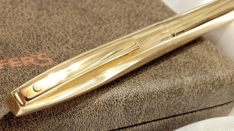 Photo of a pen produced by Sheaffer. Model: Sheaffer Imperial. Filling system: cartridge filler. In lined pattern gold rolled metal. Stylist 777 version.