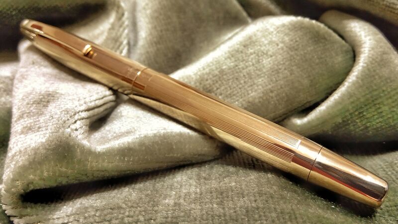 Photo of a pen produced by Sheaffer. Model: Sheaffer Imperial. Filling system: Touch Down. In lined pattern gold rolled metal. Imperial Triumph version (AS17T), with hooded feed and shorter smooth band.