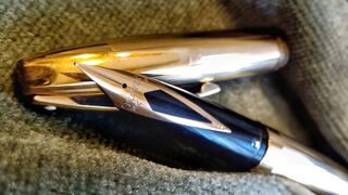 Foto di una penna Sheaffer. Modello: Sheaffer Imperial. Caricamento "Touch Down". Realizzazione in metallo laminato in oro con motivo righe. Versione Imperial Triumph (AS17T), con alimentatore aperto e banda liscia più corta. Contributo di Gustavo, (utente forum gfrico2000).