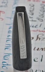 Photo of a pen produced by Sheaffer. Model: Sheaffer PFM. Filling system: "Touch Down snorkel". In black plastic resin. Detail of clip. Version PFM-I.