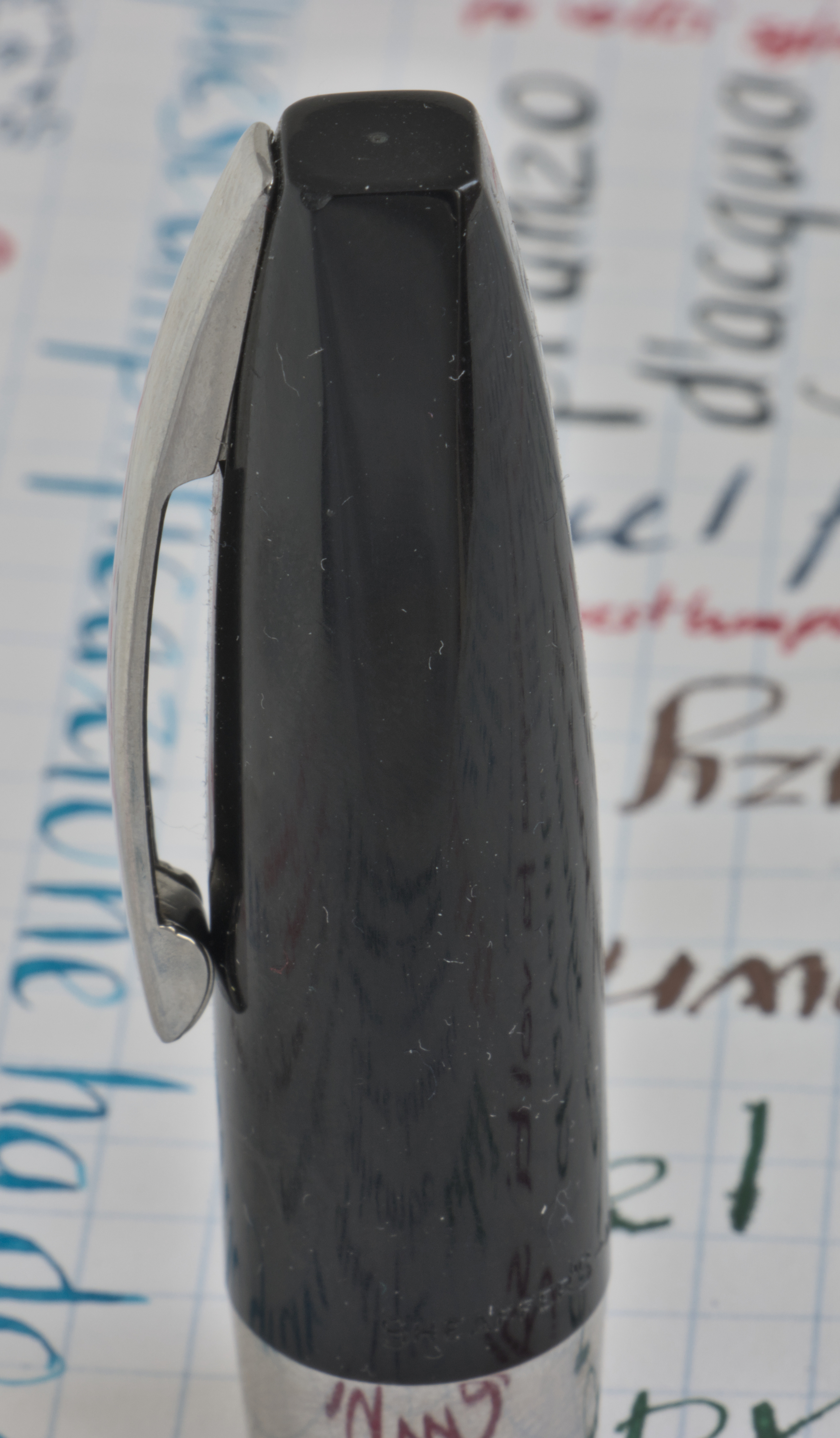 Foto di una penna Sheaffer. Modello: Sheaffer PFM. Caricamento "Touch Down snorkel". Realizzazione in resina plastica nera. Dettaglio del fermaglio. Versione PFM-I.