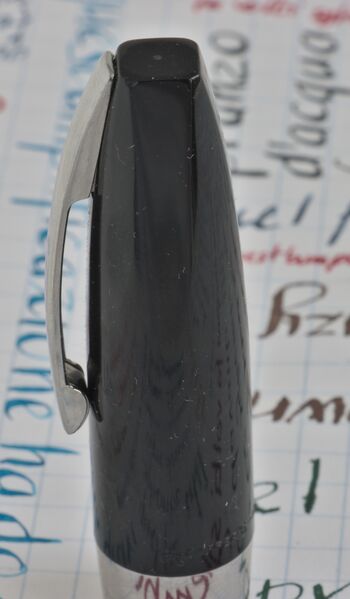 Photo of a pen produced by Sheaffer. Model: Sheaffer PFM. Filling system: "Touch Down snorkel". In black plastic resin. Detail of clip. Version PFM-I.