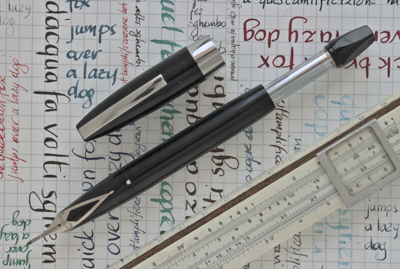 Foto di una penna Sheaffer. Modello: Sheaffer PFM. Caricamento "Touch Down snorkel". Realizzazione in resina plastica nera. Versione PFM-I.