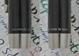 Foto di una penna Sheaffer. Modello: Sheaffer PFM. Caricamento "Touch Down snorkel". Realizzazione in resina plastica nera. Dettaglio della stampigliatura. Versione PFM-I.