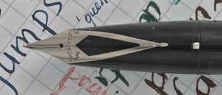 Photo of a pen produced by Sheaffer. Model: Sheaffer PFM. Filling system: "Touch Down snorkel". In black plastic resin. Detail of nib. Version PFM-I.