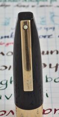 Photo of a pen produced by Sheaffer. Model: Sheaffer PFM. Filling system: "Touch Down snorkel". In black plastic resin. Detail of clip. Version PFM-III.