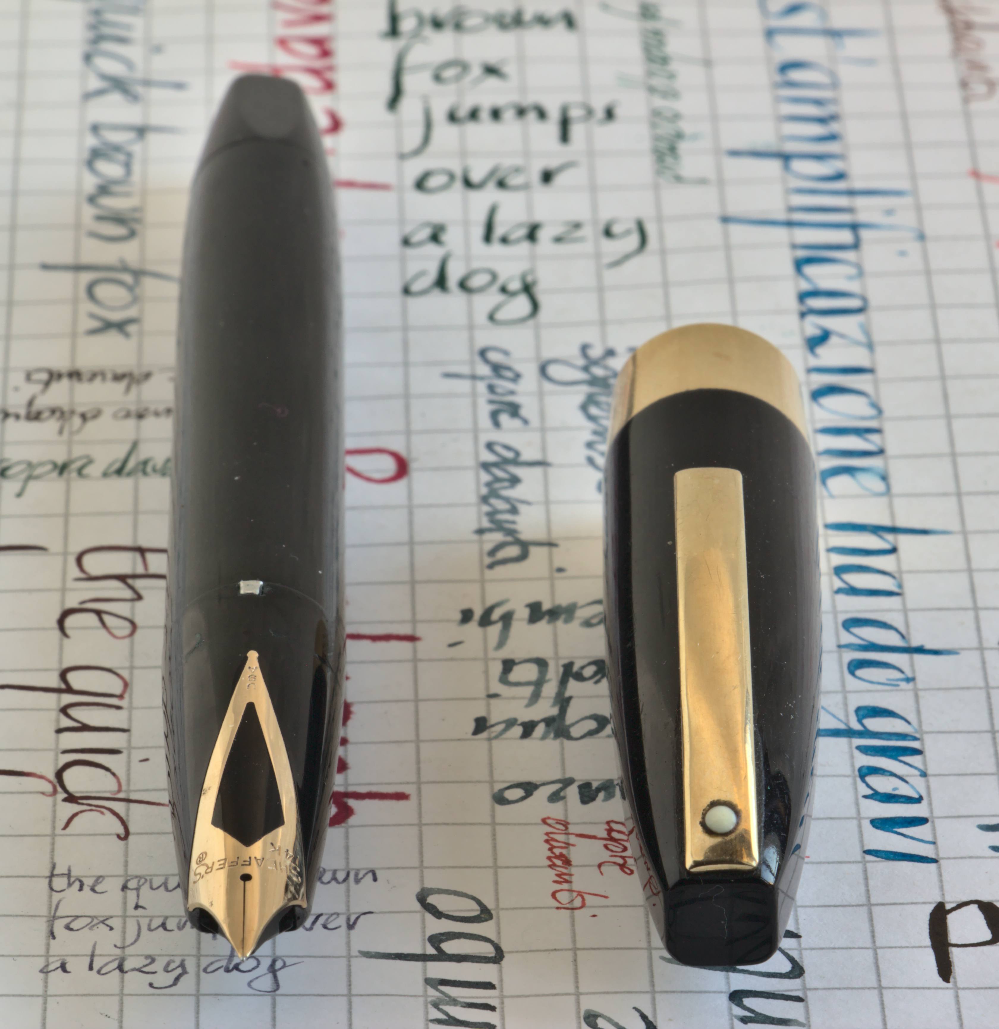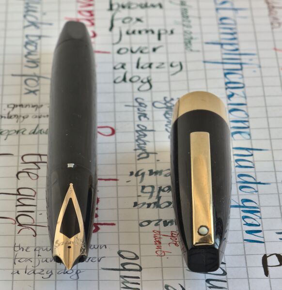 Photo of a pen produced by Sheaffer. Model: Sheaffer PFM. Filling system: "Touch Down snorkel". In black plastic resin. Version PFM-III.