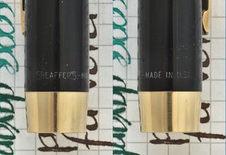 Foto di una penna Sheaffer. Modello: Sheaffer PFM. Caricamento "Touch Down snorkel". Realizzazione in resina plastica nera. Dettaglio della stampigliatura. Dettaglio della veretta. Versione PFM-III.