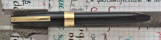 Foto di una penna Sheaffer. Modello: Sheaffer PFM. Caricamento "Touch Down snorkel". Realizzazione in resina plastica nera. Versione PFM-III.