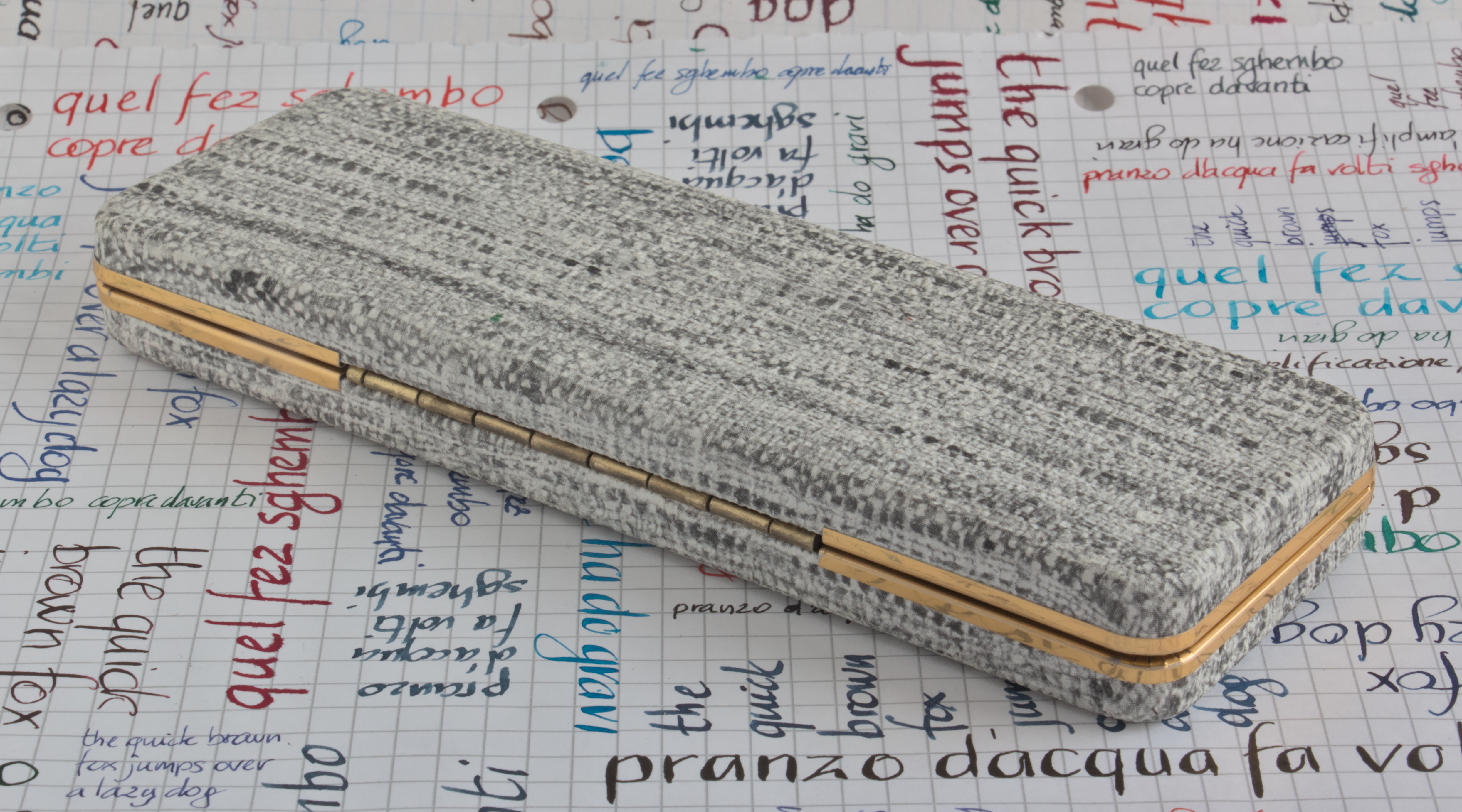 Photo of a pen produced by Sheaffer. Model: Sheaffer PFM. Filling system: "Touch Down snorkel". In blue plastic resin. Detail of box. Version PFM-III.