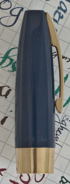 Photo of a pen produced by Sheaffer. Model: Sheaffer PFM. Filling system: "Touch Down snorkel". In blue plastic resin. Detail of cap. Version PFM-III.