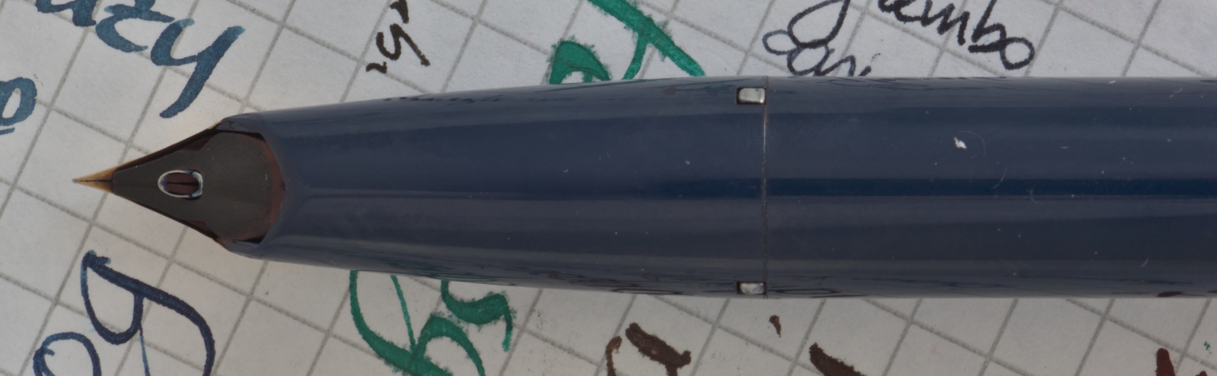 Photo of a pen produced by Sheaffer. Model: Sheaffer PFM. Filling system: "Touch Down snorkel". In blue plastic resin. Detail of nib. Detail of feeder. Version PFM-III.
