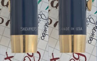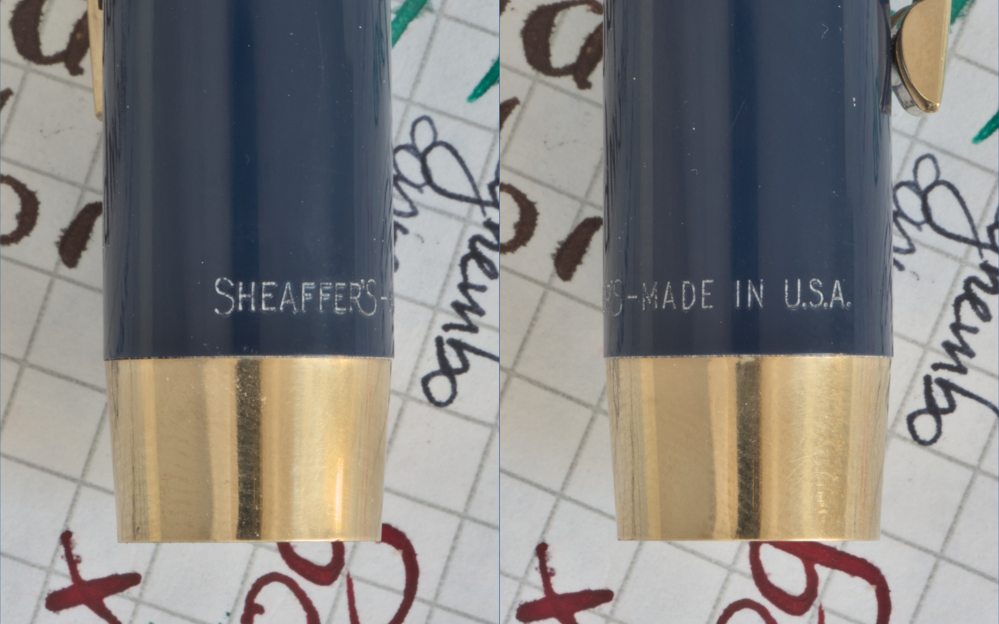 Foto di una penna Sheaffer. Modello: Sheaffer PFM. Caricamento "Touch Down snorkel". Realizzazione in resina plastica blu. Dettaglio della stampigliatura. Versione PFM-III.