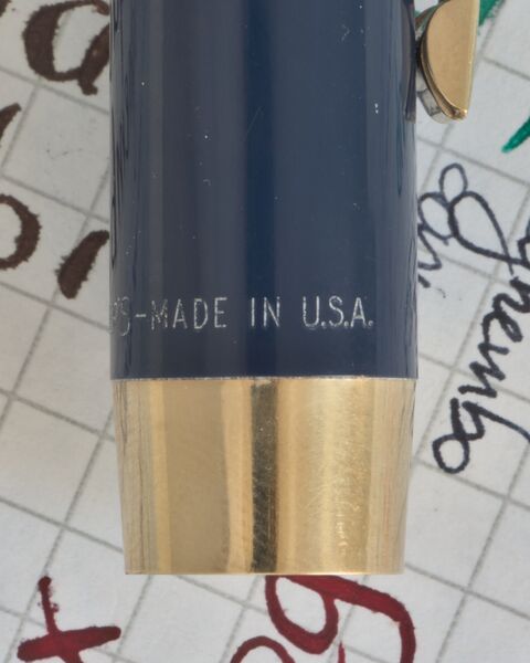 Photo of a pen produced by Sheaffer. Model: Sheaffer PFM. Filling system: "Touch Down snorkel". In blue plastic resin. Detail of inscription. Version PFM-III.