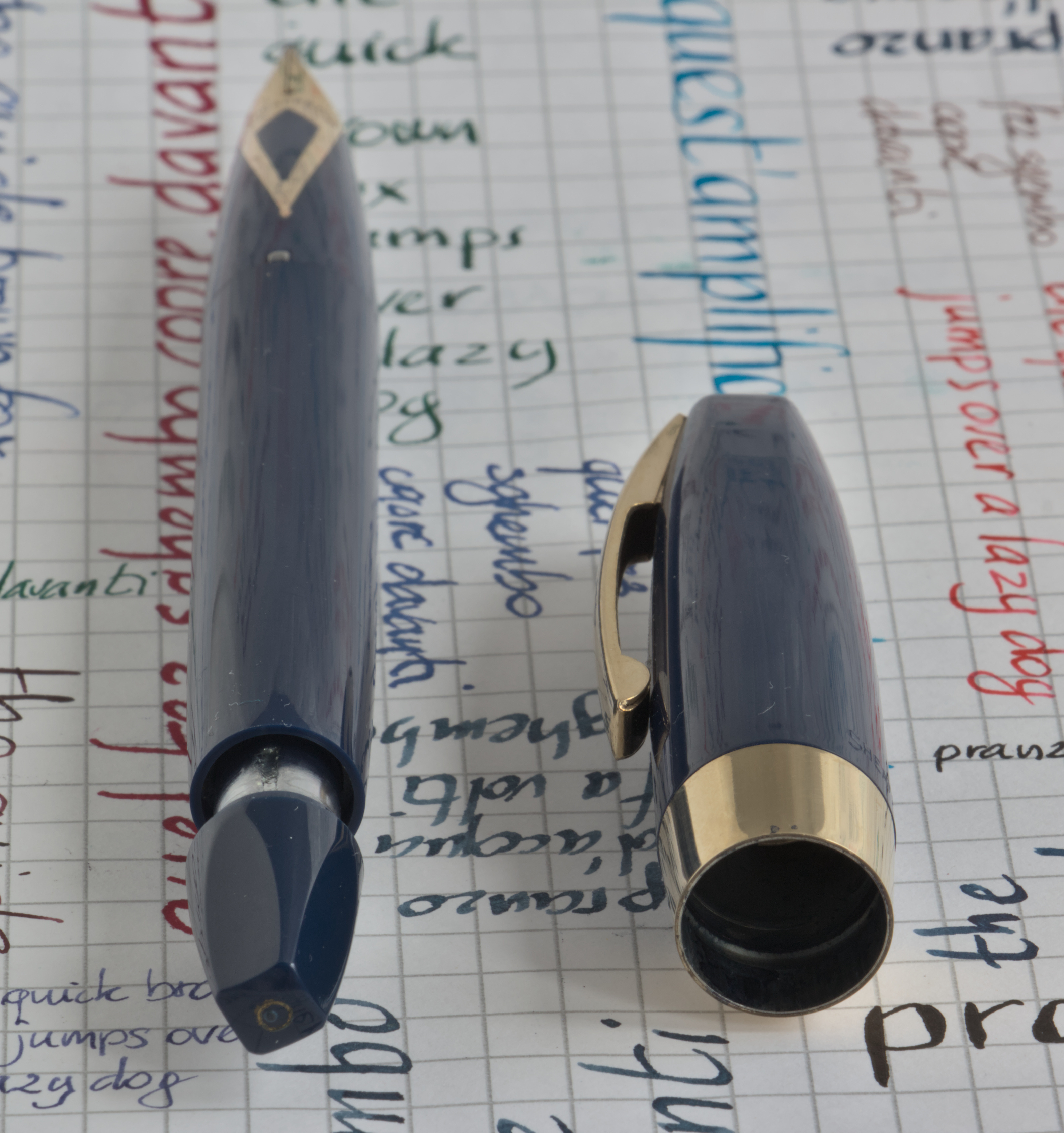 Foto di una penna Sheaffer. Modello: Sheaffer PFM. Caricamento "Touch Down snorkel". Realizzazione in resina plastica blu. Versione PFM-III.